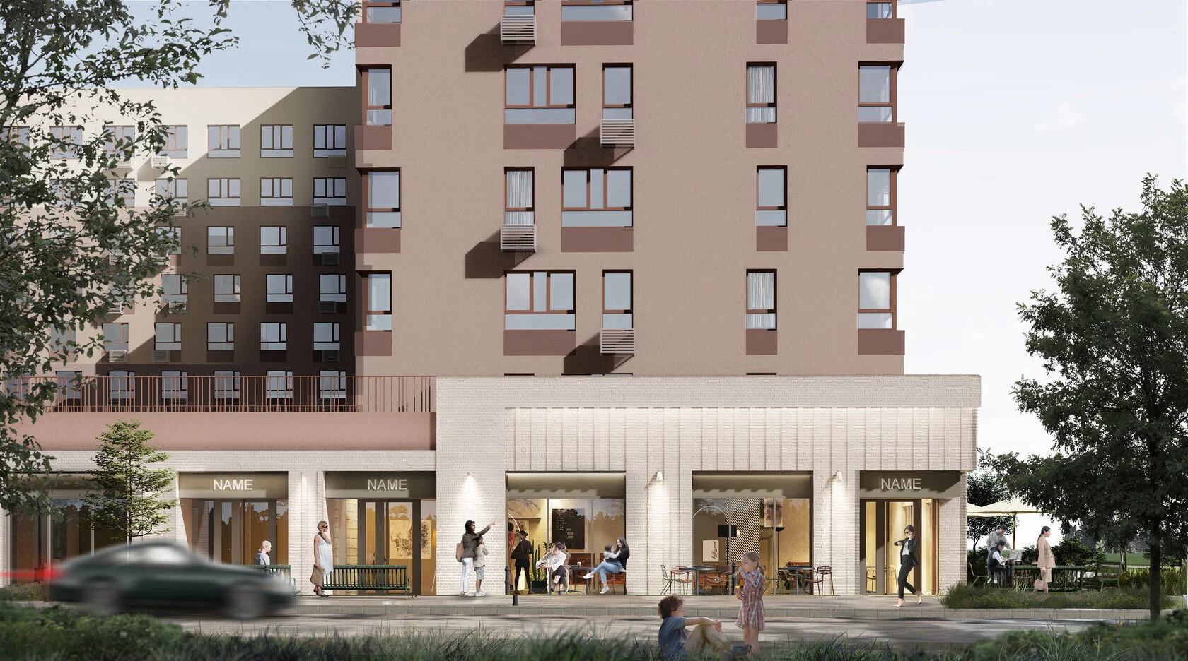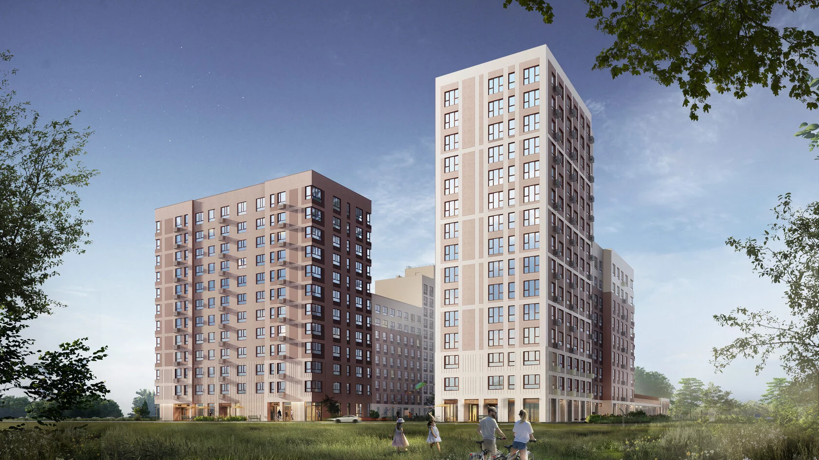 Вход домой через сквозные парадные на уровне земли. Внутри дизайнерская отделка и понятная навигация. Снаружи витражное остекление и мягкое вечернее освещение.
