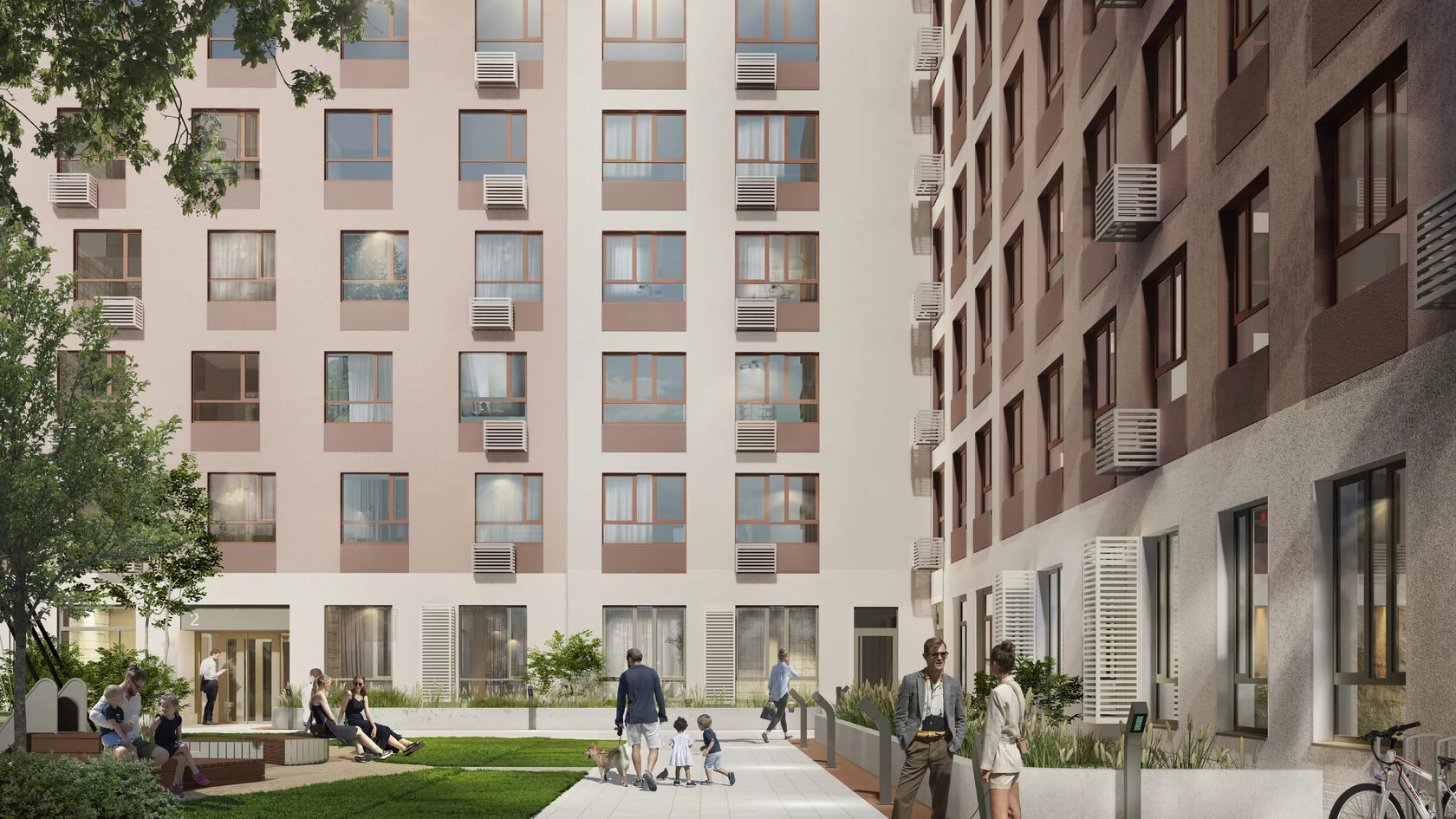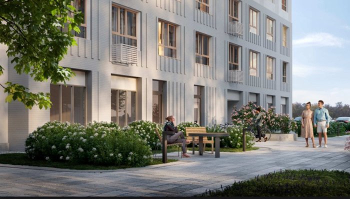 Светопрозрачные входные группы; домофон в тёплом тамбуре; доступ в парадные по Face ID; колясочные